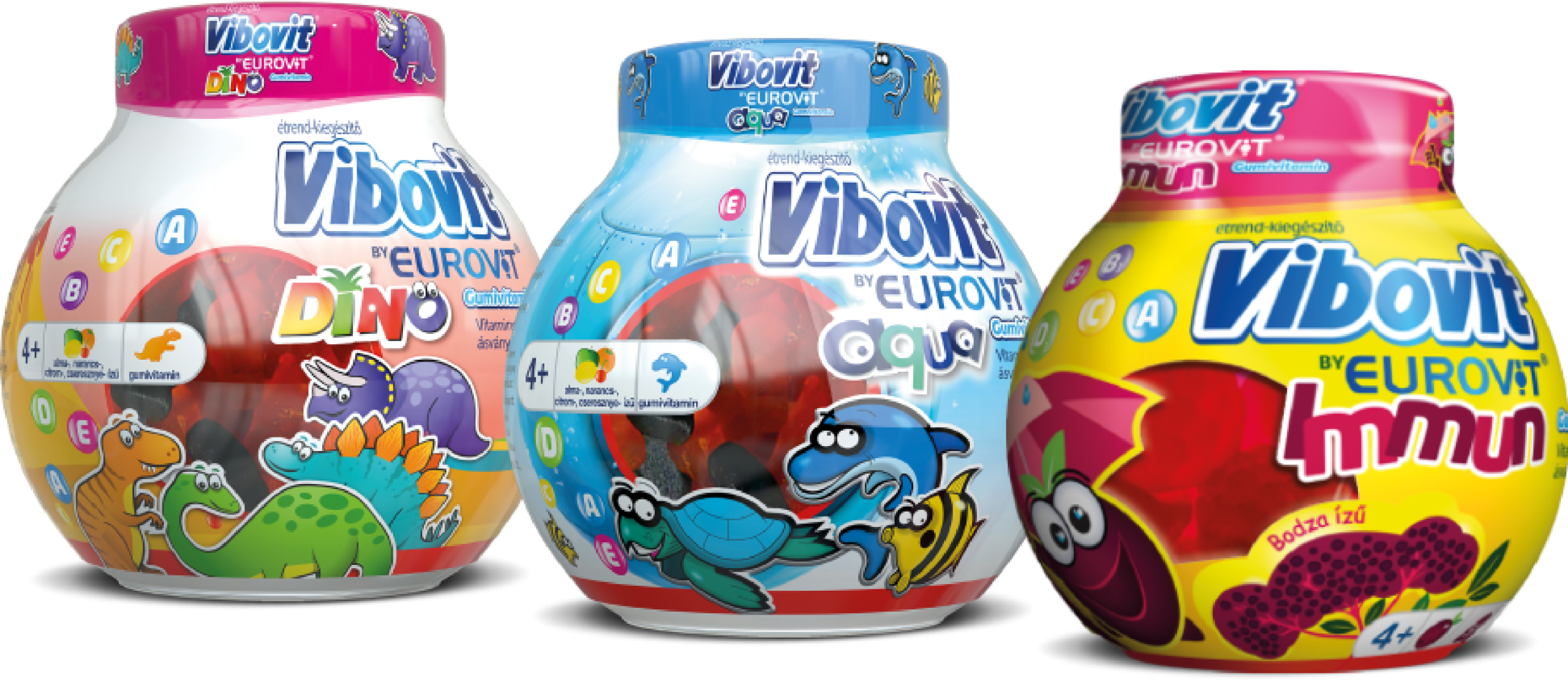 Vibovit by Eurovit Immun gumivitamin vitaminokat és ásványi anyagokat tartalmazó étrend-kiegészítő. Vibovit by Eurovit Dino gumivitamin vitaminokat és ásványi anyagokat tartalmazó étrend-kiegészítő. Vibovit by Eurovit Aqua gumivitamin vitaminokat és ásványi anyagokat tartalmazó étrend-kiegészítő. Eurovit C-vitamin 1000 mg C-vitamint tartalmazó, citrom ízű, cukormentes, étrend-kiegészítő pezsgőtabletta édesítőszerekkel.