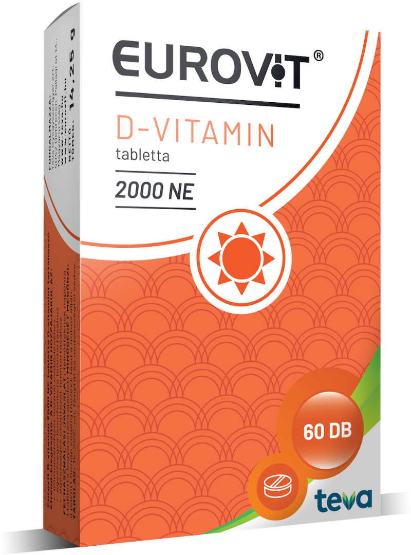 Az Eurovit D-vitamin 2000 NE tabletta D-vitamint tartalmazó étrend-kiegészítő. Az étrend-kiegészítő használata nem helyettesíti a kiegyensúlyozott, vegyes étrendet és az egészséges életmódot. Forgalmazza: Teva Gyógyszergyár Zrt. 4042 Debrecen, Pallagi út 13.