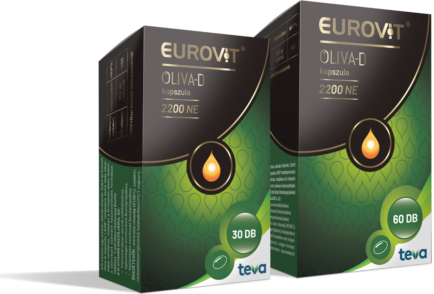 Az Eurovit Oliva-D Forte 2200 NE kapszula D-vitamin extra szűz olívaolajban étrend-kiegészítő. Az étrend-kiegészítő használata nem helyettesíti a kiegyensúlyozott, vegyes étrendet és az egészséges életmódot. Forgalmazza: Teva Gyógyszergyár Zrt. 4042 Debrecen, Pallagi út 13.