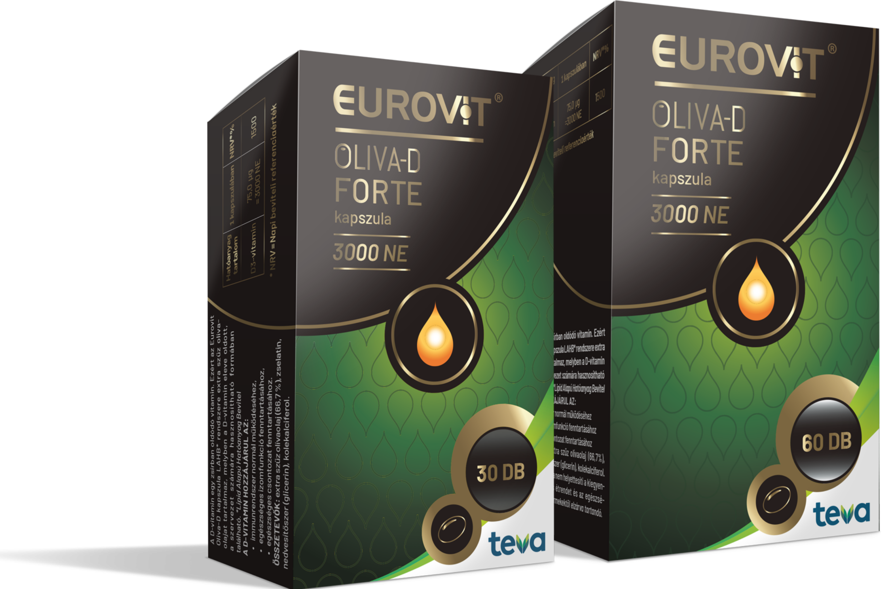 Az Eurovit Oliva-D Forte 3000 NE kapszula D-vitamin extra szűz olívaolajban étrend-kiegészítő. Az étrend-kiegészítő használata nem helyettesíti a kiegyensúlyozott, vegyes étrendet és az egészséges életmódot. Forgalmazza: Teva Gyógyszergyár Zrt. 4042 Debrecen, Pallagi út 13.